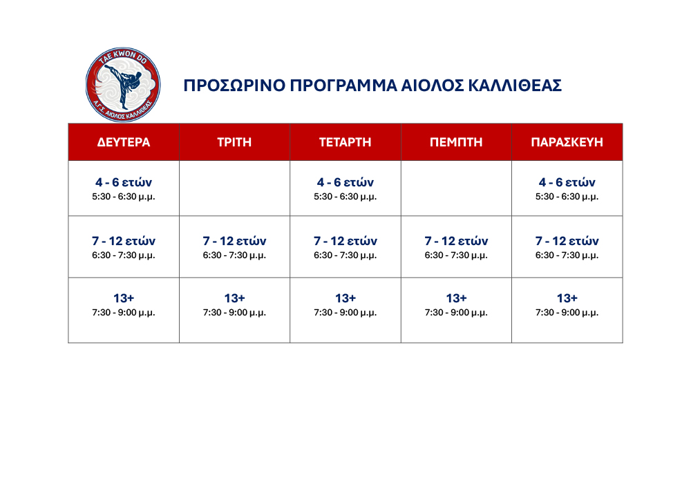 Στον Α.Γ.Σ. Αίολος Καλλιθέας, το πρόγραμμα προπονήσεων είναι σχεδιασμένο με συνέπεια, σαφή δομή και σεβασμό στις ανάγκες κάθε ηλικίας και επιπέδου. Η καθημερινή ροή των μαθημάτων επιτρέπει στους ασκούμενους — μικρούς και μεγάλους — να αναπτύσσονται σταδιακά και με ασφάλεια, εντός ενός παιδαγωγικού και εμπνευσμένου περιβάλλοντος.